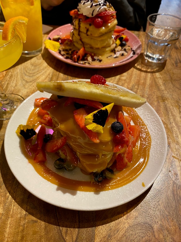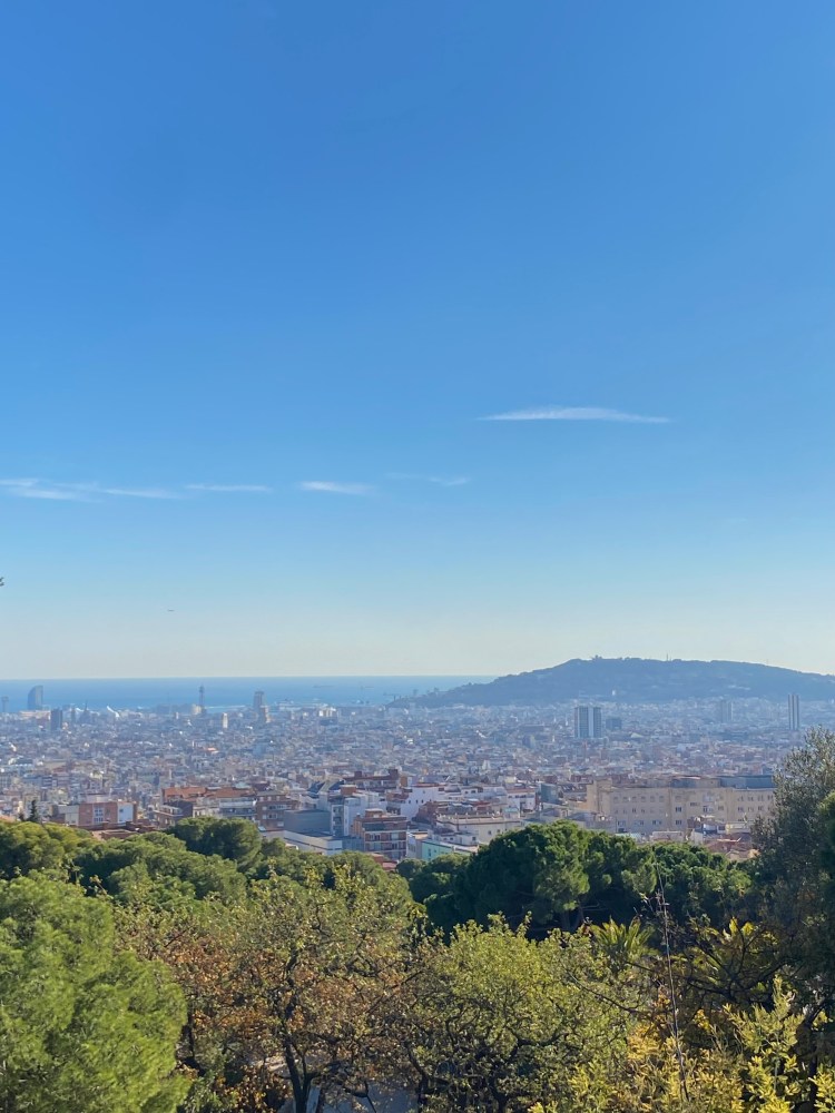 Skipping ahead to Monday, we did our unofficial architecture tour of the city. Number 1, the Catedral de Barcelona, which was gorgeous but had a huge, glaring Samsung ad on the front of it. It was one of those sad and funny moments where you realize the effect of consumerism and capitalism. The gothic quarter surrounding the cathedral felt like a portal to olden times, with the famous bustling street La Rambla right next door. By this point, we were a bit peckish and got brunch at Zenith to enjoy a mimosa and a savory pancake stack (yum!). A quick hop away was stop number 2, Casa Milà, a famous Antoni Gaudí-designed house with his signature wavy style, and number 3, Casa Batlló, another curved house with beautiful stained-glass decor. Since coffee shops are the best way to capture the vibe of a nation and its people, we took an obligatory coffee break at Buenas Migas. This proved to be incredibly helpful as we took the long, uphill trek up Passeig de Gràcia to number 4, Park Güell. A park designed by Gaudi, it features beautiful wavy architecture, lots of natural elements with greenery and birds (with parrots!), and a great overlook of the city. We decided we weren’t quite done and hit number 5, Recinte Modernista de Sant Pau. A former hospital-turned-museum, it had a beautiful architectural style in a quieter part of town. Absolutely exhausted, we grabbed green smoothies at Green Kiss and headed back. We grabbed kebabs at the nearby La Turka with Aidenn and friends (can you tell they love kebabs yet?). Another chill Wii-filled evening and an early night after a solid 26,000 steps day.