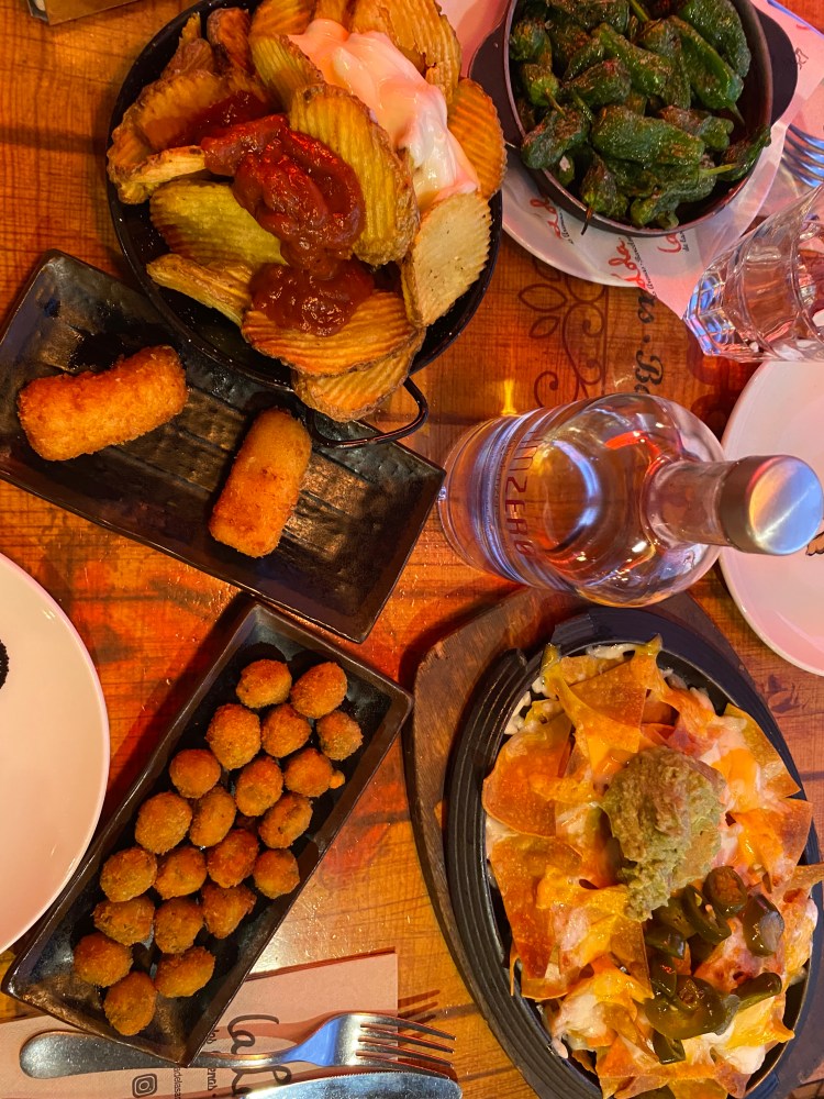 Naturally, we get up the next day at 2 PM and walk along the beach to find a paella place. With my broken and poorly-conjugated Spanish, I figured out we wouldn’t get a beachside place without a reservation until 4 PM, so we decided to walk inland into the neighborhood of Poblenau. It was such a vibe with the cafes being full of people smoking, eating ice cream, and/or drinking coffee (some even at the same time!). We found a tapas/paella restaurant called Mar Bella and grabbed a bit of both. With our tanks full, we walked to the Sagrada Familia, a huge church that’s been under construction since 1882 and dominates the Barcelonian skyline with its gothic spires. A 140-year construction timeline is absolutely mind-boggling, but looking at the incredibly ornate details and sheer size of the cathedral, it kind of makes sense. The scale hits you once you go inside and look up at the vaulted ceilings and the tall stained glass pieces. One of the most iconic things about the church is what’s outside the church—Taco Bell and Burger King! They really know their audience. We grabbed the metro back, played some more Wii tennis, and got Japanese food at Need. Side note, there were a TON of Japanese and Asian food places, especially ramen and sushi, which were on nearly every corner. We had to wake up early the next day for our Andorran adventure (the next blog post), so early night!