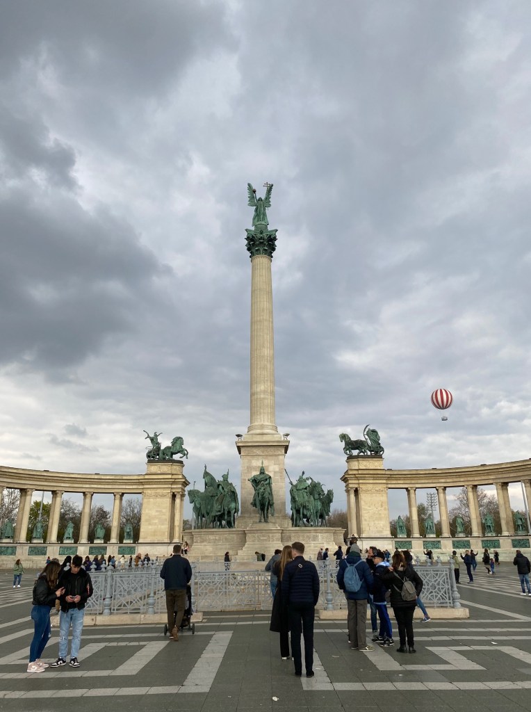 Since Bolt’ing was cheaper than public transport, we hopped in one towards Vajdahunyad Castle to try to burn off some of that pasta and ice cream. This castle was beautiful in a completely different way: it felt like a beautiful park, with some castle spires providing a beautiful interruption to the flowering plants and trees. It was truly relaxing, complete with a hot air balloon in the background. As we strolled around the castle grounds and surrounding greenspace, we ended up exploring the Szechenyi Thermal Bath. Logistically, it didn’t make sense to go into the bathhouse (plus, what is a bathhouse besides a lukewarm public path). Instead, we soaked in (pun intended) the murals and sculptures in the lobby and left to walk around Holnemvolt Park (Once Upon a Time Park). Again, we didn’t go inside since it was part of the zoo and cost money, but we explored the outside before walking to the nearby Heroes Square.
