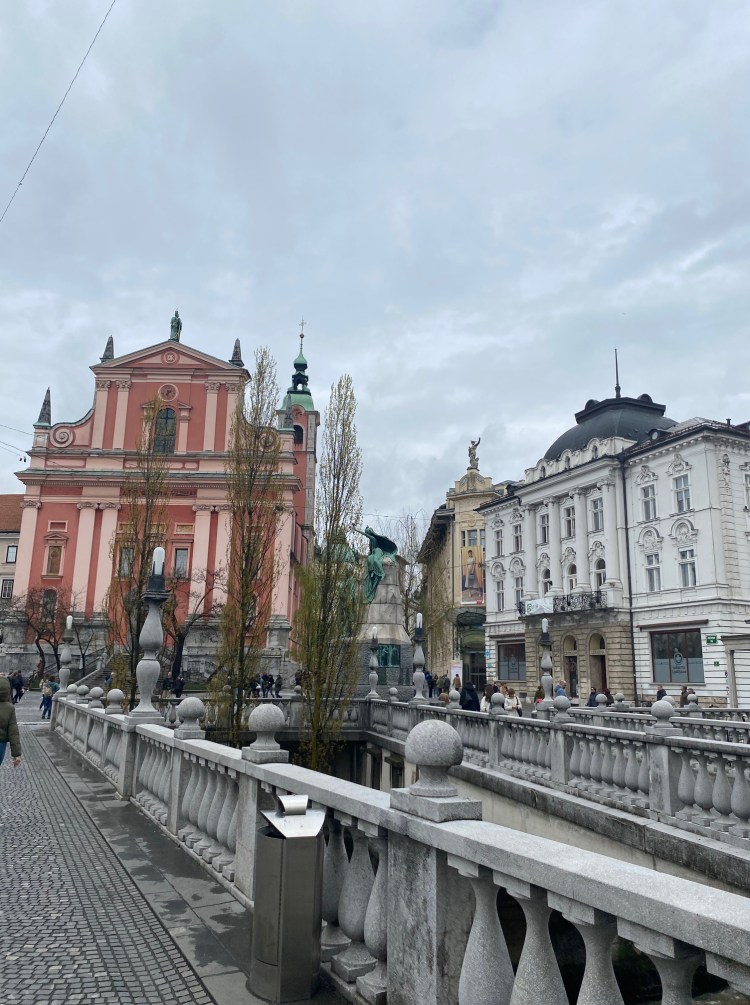 I was ready to take a nap, but since we only had a day in this beautiful city and country, we wanted to make the most of it. Josh and I walk past the cathedral; it looked really pretty but we didn’t go inside since it cost a couple Euros and we’d seen dozens of cathedrals during our semester in Europe. As we approached the main square, Josh and I bid goodbye to our Dutch and Swedish friends. This area of the city featured the beautiful, pink Franciscan Church of the Annunciation and the famous triple bridge crossing the Ljubljanica River. I don’t really understand why they built 3 separate bridges converging at the same point, but it looks cool!