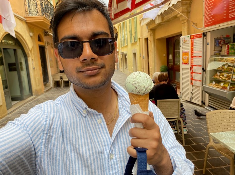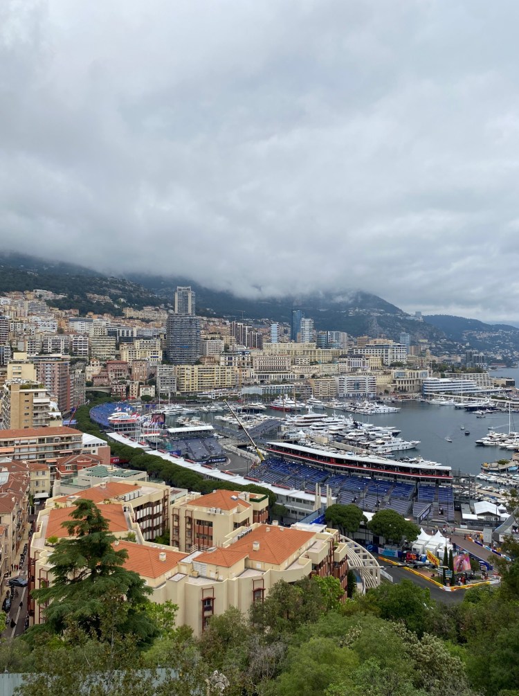 We had grabbed food during qualifiers (pretty solid and reasonably priced, especially compared to American sporting events!), which freed up our lunch break to squeeze all of our Monaco sightseeing. We headed to Monaco’s Old Town, which involved climbing up a pretty sizeable hill. The views from the top were second to none, though, and we made sure to take lots of pictures. Funnily enough, we had a clear view of the racecourse—this might be a killer money-saving move for the actual Grand Prix! We also saw the Palace of Monaco, complete with an armed guard patrolling the front. I convinced the crew (Iris, Harsh, Walter, and Owen) to walk to the Monte Carlo casino, so we set off (after getting a quick ice cream cone).