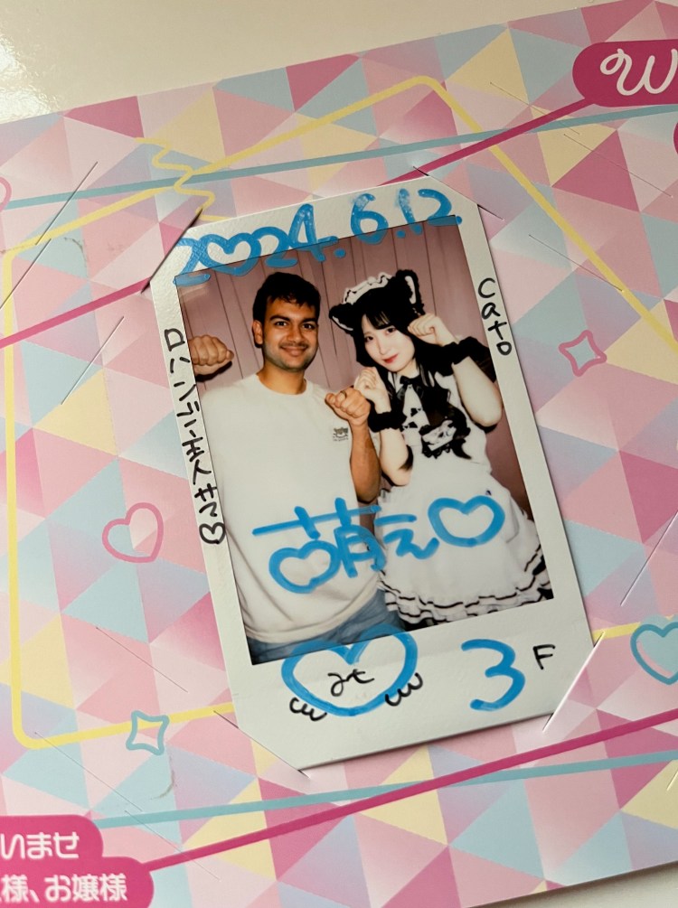 After settling in, I took a train to Akihabara station and went shopping in the attached mall (and bought 3 things within 15 minutes). I met up with Joe in Akihabara, which is featured heavily in one of my favorite animes, Stein’s;Gate. We walked past the radio tower that gets hit by a UFO in episode 1 and the main station platform where…well, no spoilers! We walked around a bit, and I helped myself to a cheap SD card from the electronics stalls, which are famous in this neighborhood. As our apetites increased, what better place to go than a maid cafe! We went to at-home, a 7-story maid cafe, and lucked out with the wait (because we were late for lunch) and were immediately seated. The experience of a maid serving you and calling you “master” was a little bit weird and cringe-worthy, but when in Rome! We each got a drink with art hand-drawn by the maid, omurice with ketchup patterns drawn by her, and a polaroid with her too. The food was meh but the experience was a cool once-in-a-lifetime experience. I didn’t realize that these cafes actually exist and are even visited by regulars! If you’re in the area, also check out Cafe Mai:Lish: the maid cafe featured in Stein’s;Gate (it was just closed on Wednesdays, which is when we went).