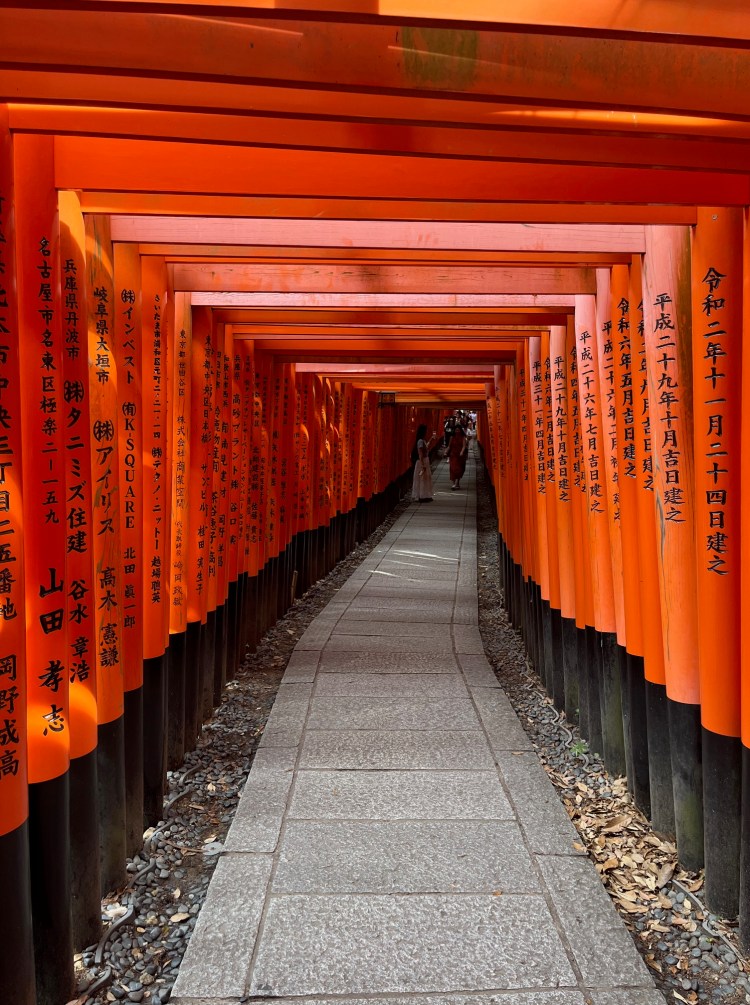 On the way up, there are lots of small shrines filled with idols and mini Torii that visitors have written their wishes on. Some of them even had small stores with snacks and knick-knacks, cared for by a single shopkeeper. On the way down, I saw a beautiful cat perched on one of the gates, sleeping peacefully with a view of Kyoto behind it. I wrapped up my hike by exploring the area around the main temple, which was like a village of shrines, complete with restaurants, shops, and dozens of small temples. I even bought a bracelet at one of the temples and the monk taking care of the temple let me feed his koi fish in the neighboring pond. Overall, it was a very unique experience and completely different than what I expected from the normal gates.