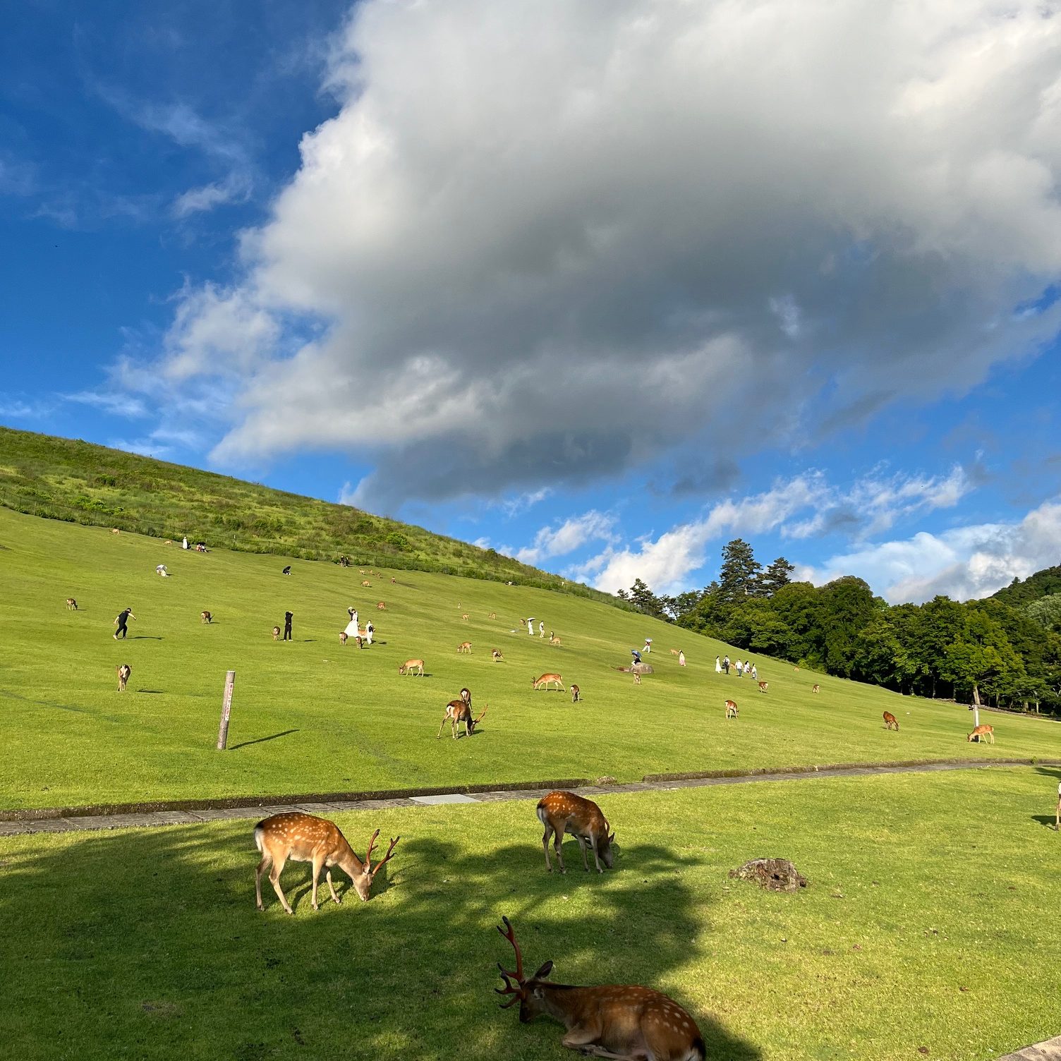 It was a quiet, forested area that eventually opened up to a small town and the entrance to Wakasuka Hill. This hill was jaw-droppingly gorgeous: deer grazing on the bright green grass on the steep hillside, people sitting on the hill and enjoying the view, and a cloud-dotted blue sky. I enjoyed the Studio Ghibli vibe of the area for a while, but after I realized that the gate to climb the hill had closed at 5PM, I decided to walk toward Kashuga Taisha. The walkway went through the woods and was lined with hundreds of bronze lanterns. These lanterns had grown moss and created a mysterious, ancient vibe as you approach the main Shinto shrine. The shrine itself was closed, but the lanterns was all I was there for.
